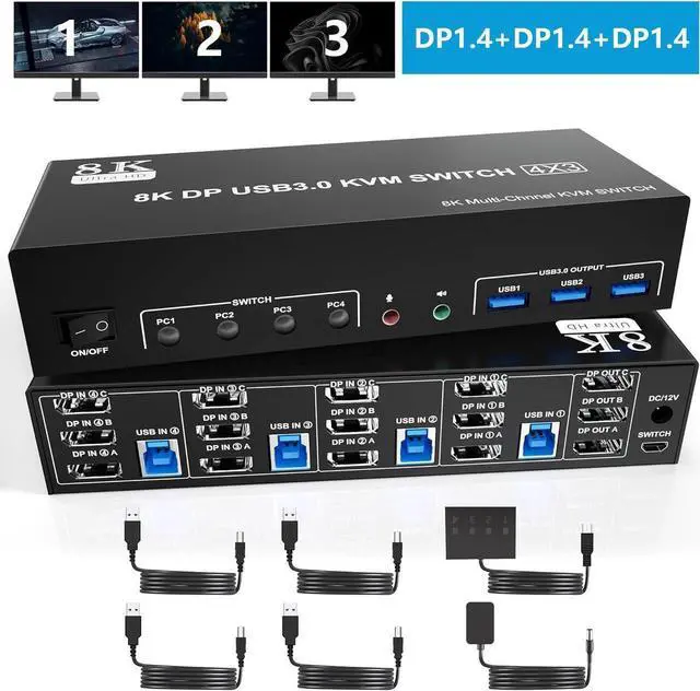 - The DP 1.4 triple monitors ( DisplayPort +DisplayPort +DisplayPort ) 4Ports kvm switch supports resolution up to 8K@60Hz and downwards.