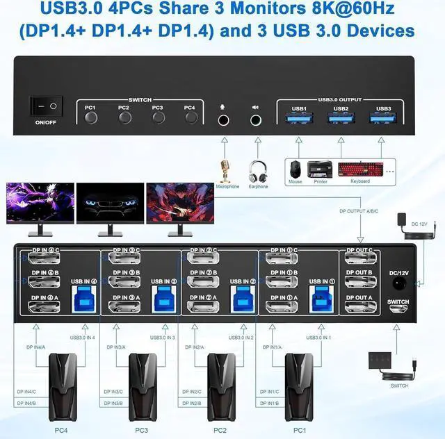 USB 3.0 Triple Monitor 3 DisplayPort KVM Switch for 4 ComputersFeatures: