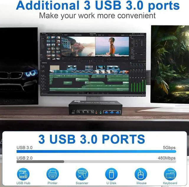 - This kvm switch 3 monitors 4 computers with 3 USB 3.0 Ports for keyboard, mouse, printers, USB headsets or webcams.