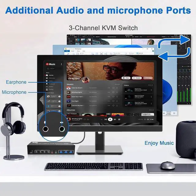 - This Triple Monitor Displayport KVM switch comes with a 3.5mm Audio Jack port with a DAC chip inside, which can be inserted into a 3-segment 3.5mm earpiece device, and a 3.5mm microphone interface, which can be inserted into a 3-segment microphone.