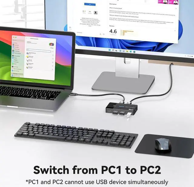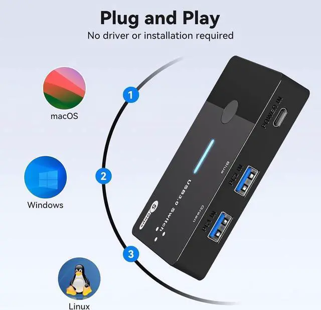 This USB Switch is an excellent choice to expand your laptop's USB 3.0 port into four, allows 2 computers to share 4 USB Devices(with USB C port), plug-and-play, no driver installation required, can easily switch between 2 Computers via a push button with LED indicates the active computer.
