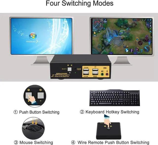 4. Support multiple switching methods via push button, mouse clicks, keyboard hotkeys, wired remote, and auto scan.
