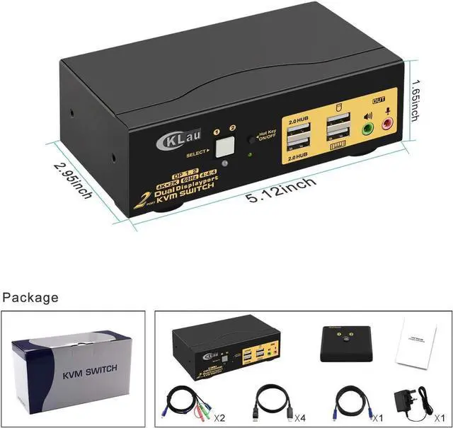 • 2. Dual Monitor KVM Displayport: Four optional switching ways: Hotkey switching(Num Lock + Num Lock + 1 / 2 + Enter, or Ctrl + Ctrl + 1 / 2 + Enter, or Scroll Lock+ Scroll Lock+1 / 2 + Enter), mouse switching (click mouse wheel 2 times), manual button switching, wired remote push button switching. Suport three display modes: extended display, mirror display and splice wall display.