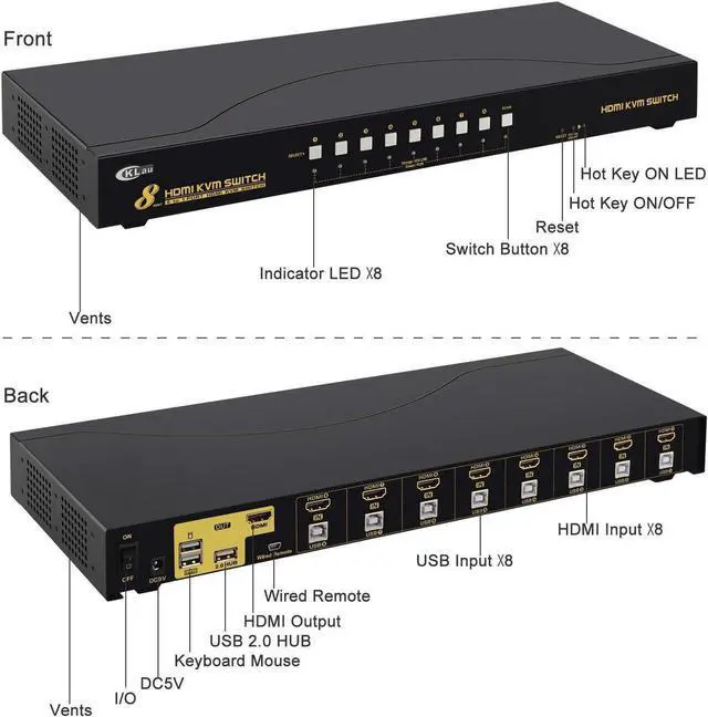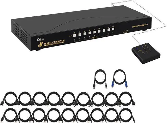 Package: 1 * 8 Port KVM switch + 1 * DC 5V 2A Power adapter + 8 * HDMI Cable + 8 * USB 2.0 cable + 1 * User manual + 1 * wired remote push button
