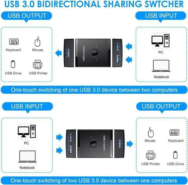 KVM USB 3.0 Bidirectional Switch Selector 2 to 1 PCs Sharing or 1 to 2 Hub for Keyboard Mouse Scanner Printer