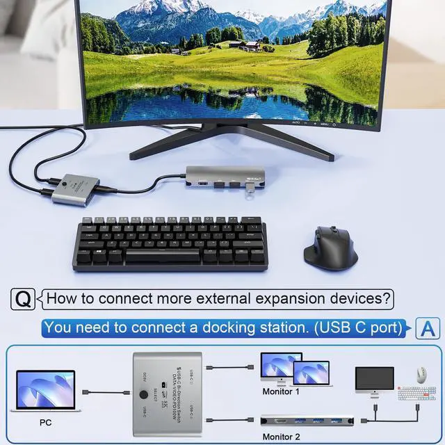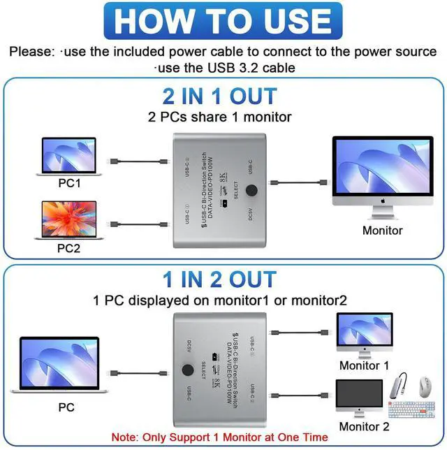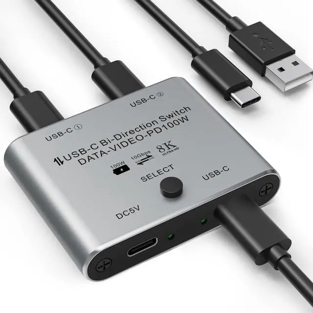 Aluminum Bidirectional 8K USB C Switch is a great choice for sharing printers or scanners between two computers in a small office environment. The USB C switch can also switch 2 USB C devices for 1 computer.
