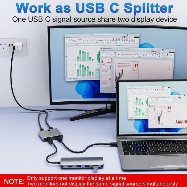 Connect 2 USB devices to 2 USB C ports and connect one computer to the USB switch. Press the button to manually select the signal USB device. (Note: 2 USB devices cannot be used at the same time)