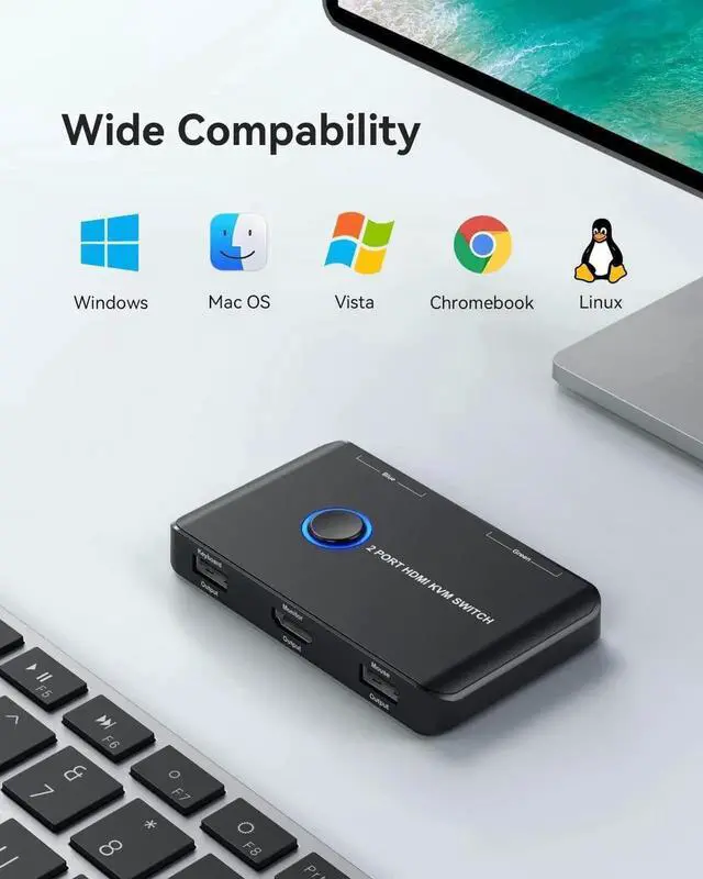 This kvm switches works with great compatibility, driver-free for Windows and Mac OS, Linux, and Chrome OS, simply plug and play, No external power required. Easily switch between 2 displays by a single click on the button.