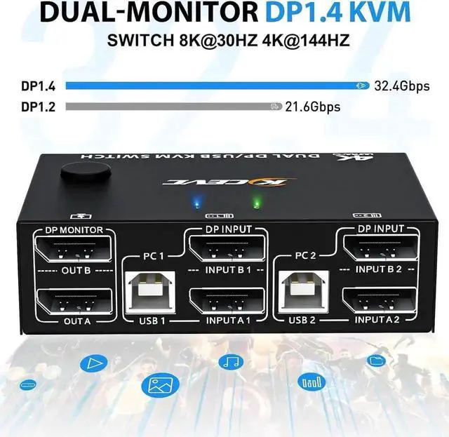 2 computers share a set of wired / wireless mouse, keyboard, printer, scanner or webcam, and display on 2 monitors