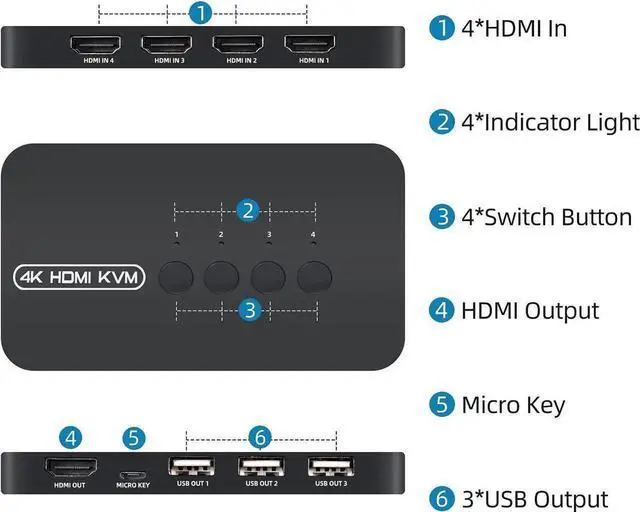 4 IN 1 OUT KVM SWITCH HDMI- to control your 4 computers by desktop controller or 4 buttons from KVM switch. Through this product with 3 ports front USB hub, 4 computer hosts or other signal sources can share 1 set of monitor, keyboard, mouse or U disk etc.
