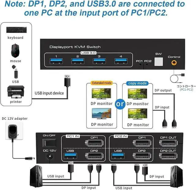 1)The USB ports are only used for transferring data such as images and musics. The Displayport ports can transmit both audio and video informations. 2)If the Displayport source is input from DP1, it needs to be output from the DP1 OUT. If the HDMI source is input from DP2, then it needs to be output from the DP2 OUT.