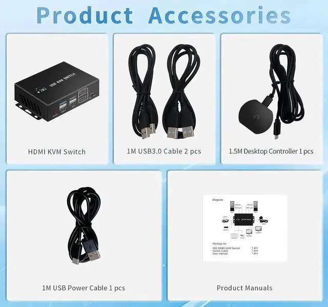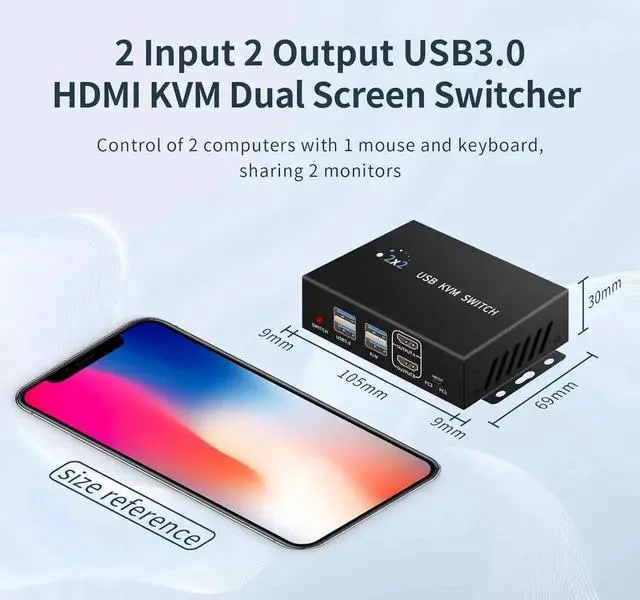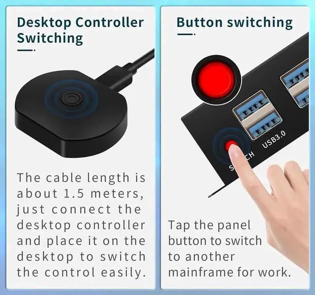 This HDMI KVM switcher allows 2 computers to be switched to share 2 4K@60HZ monitor and 4 USB 3.0 devices, mouse and keyboard and printers and scanners, etc. It also provides 2 ways of switching: desktop controller and push-button switch. Hotkey switching is not supported.