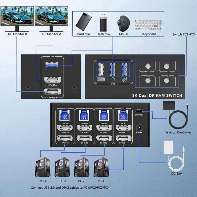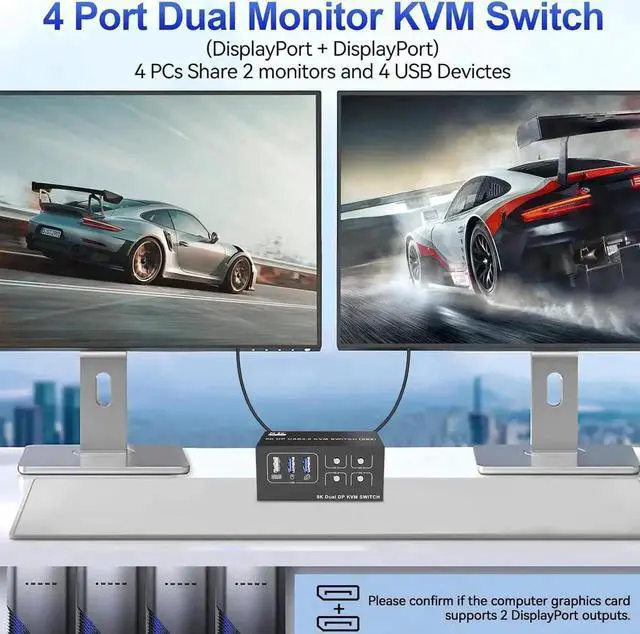1. 8K DisplayPort KVM Switch 4-Port allows 4 computers/laptops share one set of keyboard, mouse, and 2 (DisplayPort+ DisplayPort) monitors