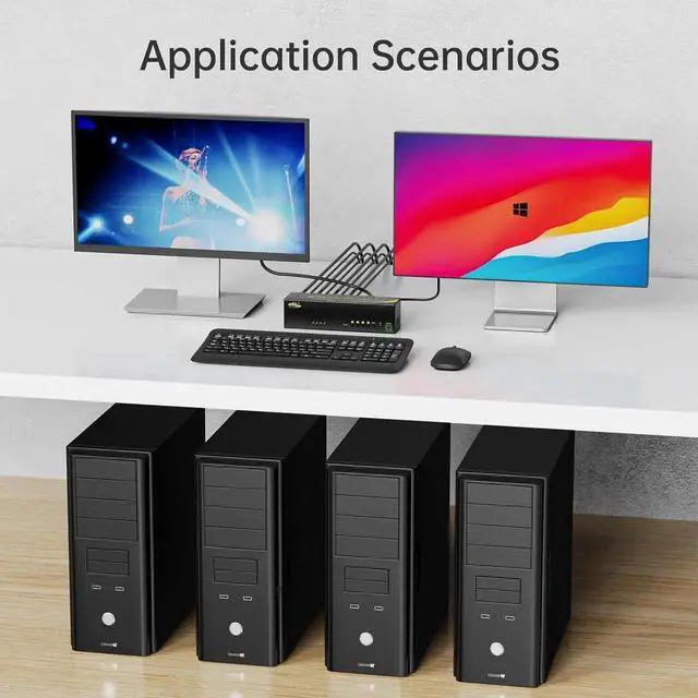4 Port Dual Monitor KVM Switch support Extended Display, 4 PCs sharing with one set of keyboard, mouse and 2 monitors which supports dual monitor extended display or duplication; Each computer and laptop need to have 2 video output interfaces and support extended display.