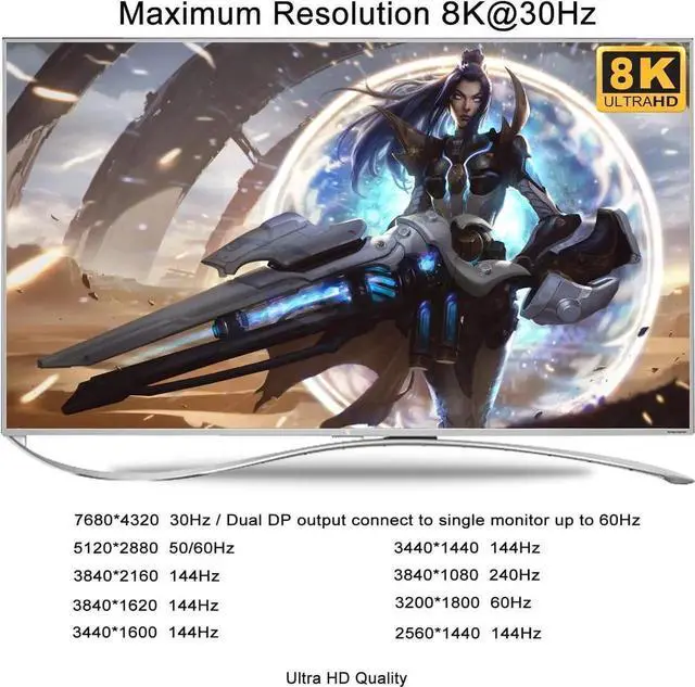 RESOLUTION: DP 1.4 KVM Switch supports 8K@30Hz, 5K@50/60Hz,4K@144Hz, 2K@144Hz and downwards. Final resolution is also subject to graphic cards, monitors, cables and adapters (if any) and how those work together;