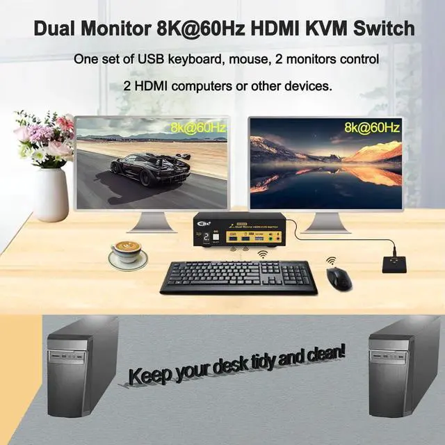 2x2 KVM SWITCH HDMI 8K 60HZ 4K 144HZ : Newest HDMI 2.1 technology to achieve max. Resolution of 7680*4320@30/60Hz, 5120*2880/1440@50/60Hz, 3840*2160@144Hz, 3440*1440@144Hz, 3840*1080@240Hz, 2560*1440@144Hz, ideal for high resolution needs and gaming without delay. Supports EDID emulation to maintain correct display.