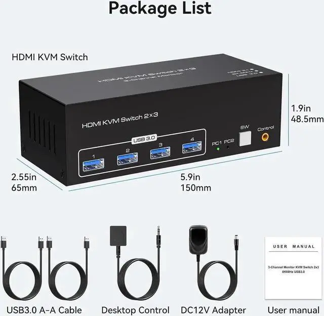 8K HDMI Triple Monitor KVM Switch for 2 Computers Share 3 Monitors and 4 USB 3.0 devices.