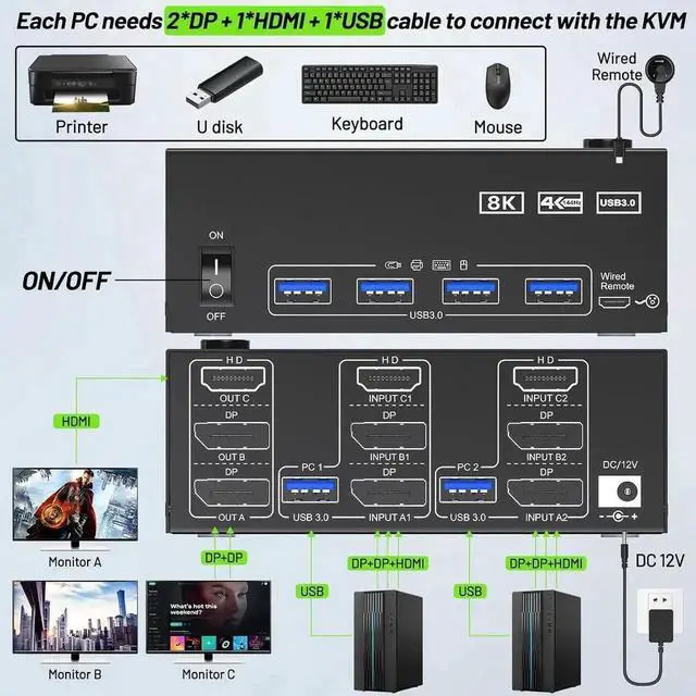 Each PC must have 1*HDMI+2*Displayport +1* USB cable to connect the 3 monitor KVM switch, OUT A, OUT B, OUT C connect to 3 monitors.