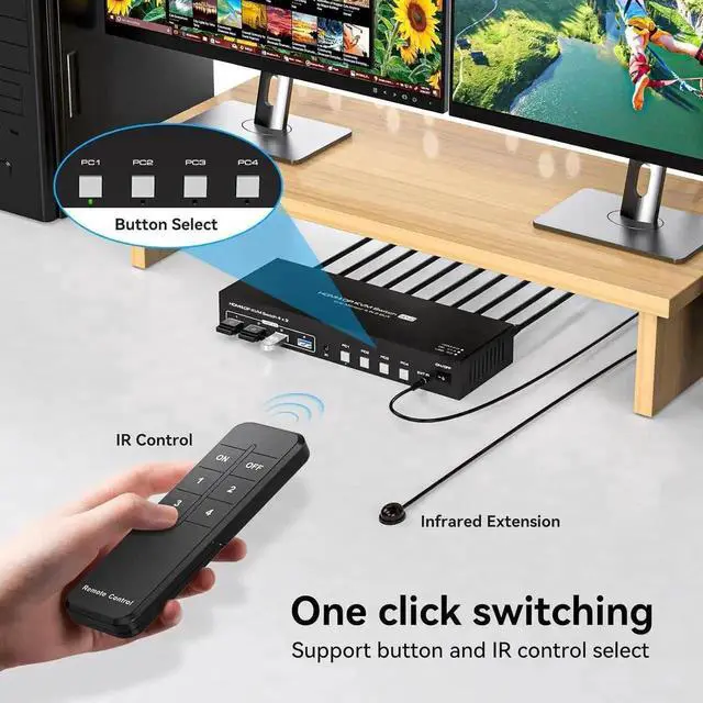 This dual monitor 4 IN 2 OUT DP+HDMI KVM Switch is for you to control them using one set of keyboard, mouse and single or dual monitors to make your work space tidy and efficient, also a premium choice for working from home. Only when your computer supports dual display or multi display, you can use this KVM to achieve 4 PC to share 2 monitors