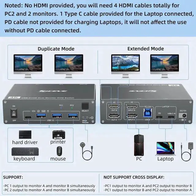 USB-C input = PC1A PD cable is not required if you do not need to charge the laptop. If you want to charge the laptop when using this KVM switch, you need an external laptop power supply to connect the USB-C KVM switch to your socket. A laptop adapter is not included. Instead, please do not use a mobile phone power supply. The PD port provides 87W charging.