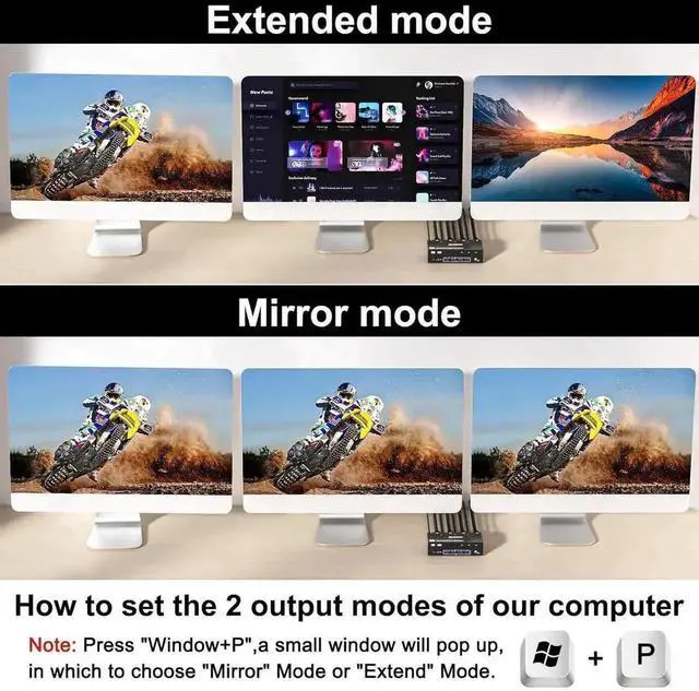 Please note: extended mode can output three different screens and mirror mode can output three identical screens.