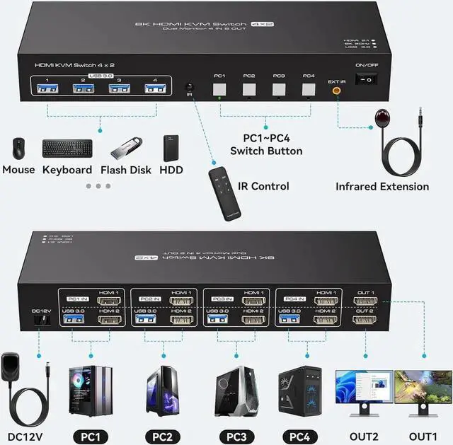 3.Two Switching Modes: The dual monitor kvm switch provides two switching modes: 1. Remote Control Switching: Easily switch between different computers using the remote control. 2.Button Switching: Simply press the white buttons for PC1 to PC4 to switch between the computers. Note: Hotkey switching is not supported.