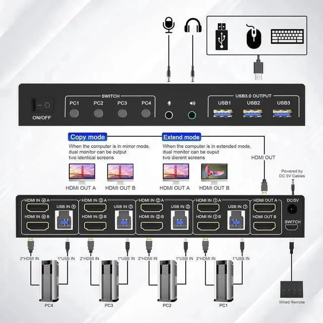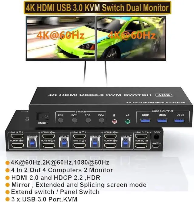 4 port USB 3.0 dual-monitor HDMI KVM Switch (HDMI + HDMI). Each input source device must be connected to two dual-monitor.