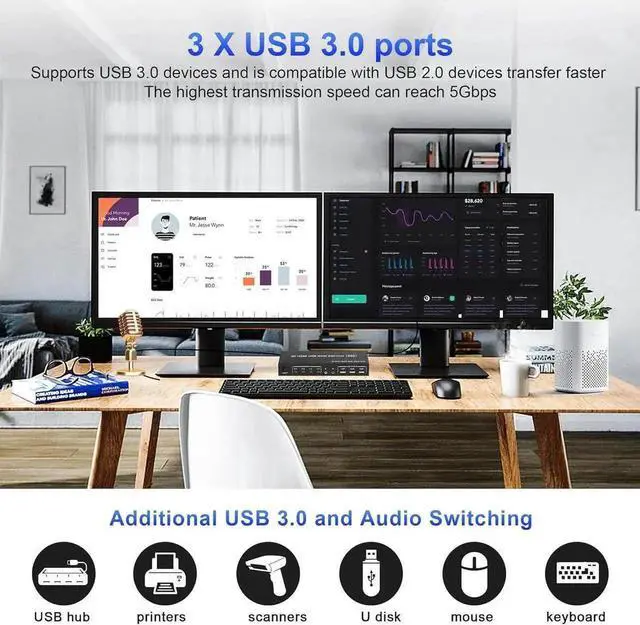 4 computers/laptops share one set of keyboard, mouse and dual monitors, and more USB 3.0 peripherals;