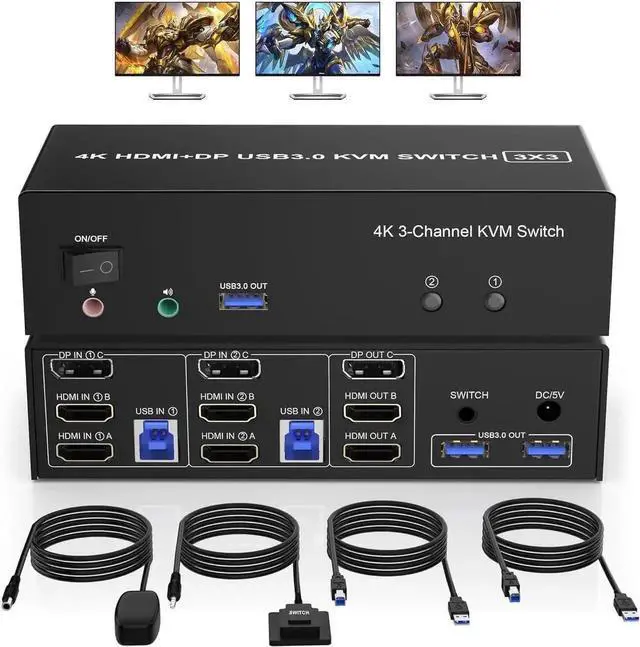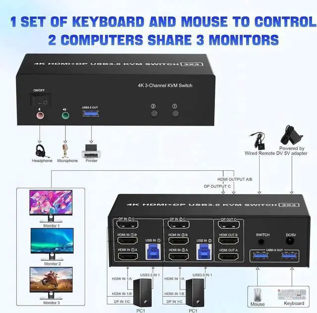 ![Alt view image 5 of 7 - Vszerda [2 HDMI + 1 Displayport] KVM Switch 3 Monitor 2 Computers, 4K@60Hz Triple Monitor KVM Switch with Audioµphone and 3 USB 3.0 Ports, 2 Computers Share 3 Monitors Keyboard Mouse Switcher](https://c1.neweggimages.com/productimage/nb640/B4D1D26020906W1SB1A.jpg)
