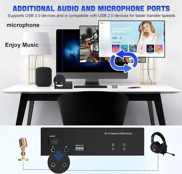 4. KVM switch with 3 USB 3.0 ports for USB devices, and with extra Audio Microphone output