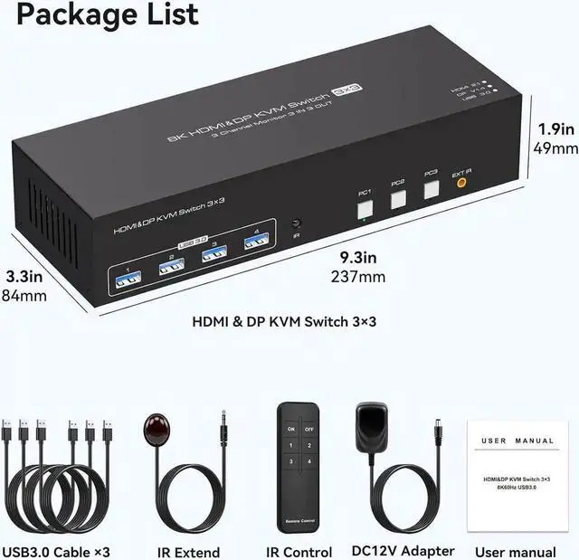 1 x Triple Monitor KVM switch, 1 x IR receiver, 1 x IR remote control, 3 x USB3 0AA cables, 1 x DC 12 V power supply, 1 x user manual