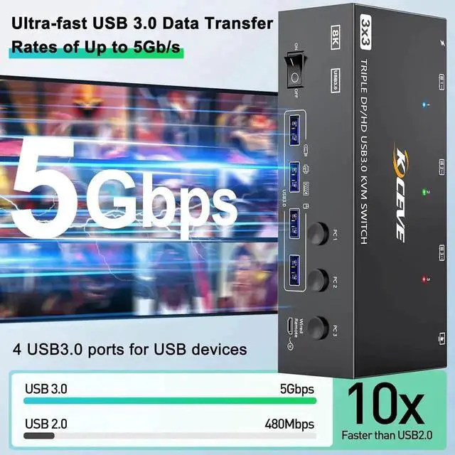 8K Triple Monitor KVM Switch 3 Computers Share 3 Monitors & 4 USB 3.0 Device