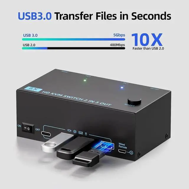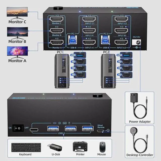 2 Switching Methdos: Triple monitors KVM switch driver-free and plug and play. you can press the button on the panel or use the wired remote controller (included in the package) to switch the computers. Two color lights indicate the active computer.
