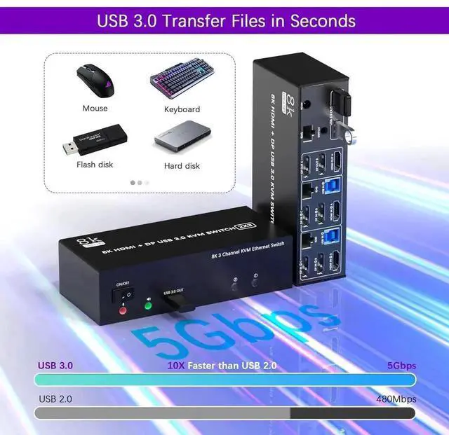 1x 2Ports 8K@60Hz USB 3.0 HDMI + 2 DisplayPort Triple Monitor KVM Switch, 2x USB 3.0 Cables, 1x Power Adapter, 1x Wired Button Switch, 1x User's manual.