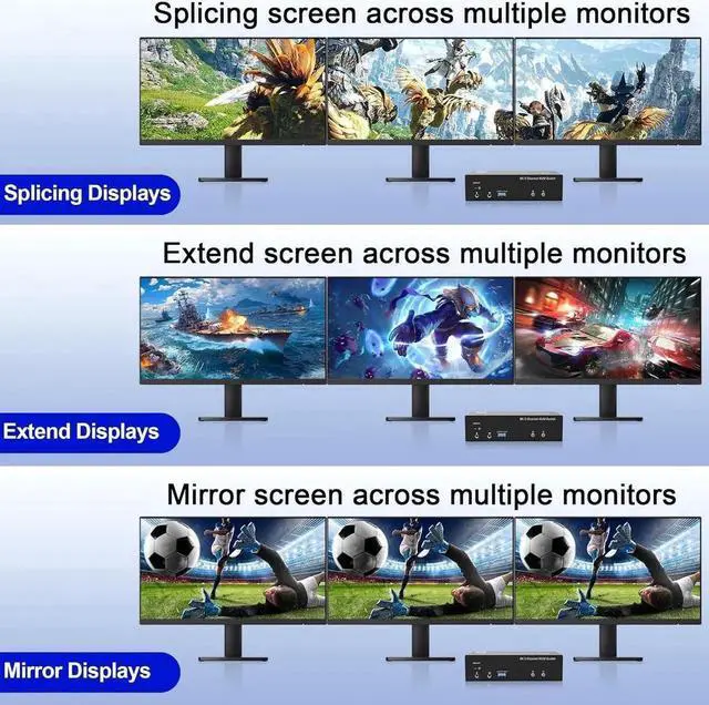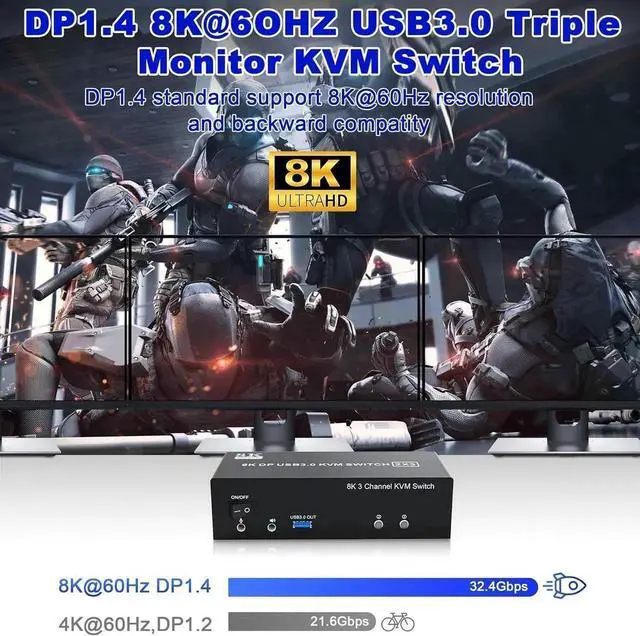 - 1x 8K@60Hz Triple Monitor KVM Switch,