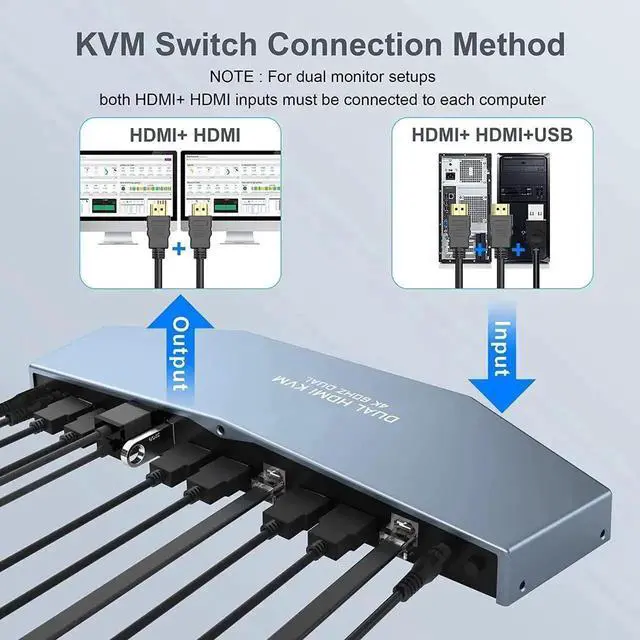 - Support front panel switch buttons and external remote control switch button to control this Dual Monitor HDMI KVM switch.