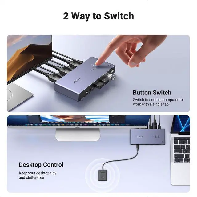 Two Switch Ways: By One-Botton switch or desktop controller, freely switch between 2 computers, saving space on your desk and sharing your display, keyboard and mouse between both computers, increasing your productivity. When the DP switch is not placed on the desktop, the controller will be a good helper for you to switch quickly. NOTE: This Displayport KVM switch does not support Hotkey Switching