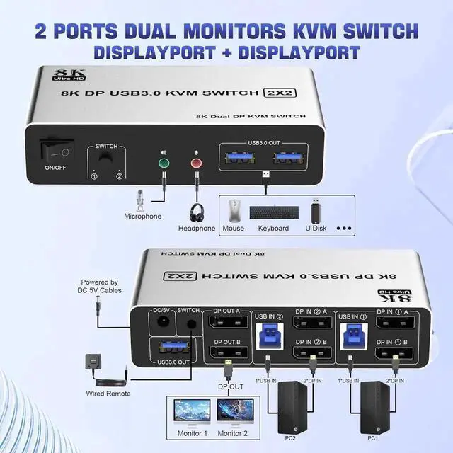 8K@60Hz DisplayPort + DisplayPort KVM Switch for 2 monitors 2 computers