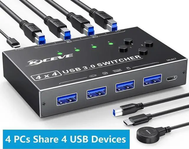 Vszerda 4x4 USB 3.0 Switch 4 Computers, 4 Port USB 3.0 Switch Selector for 4 Computer Share 4 USB Devices,Keyboard Mouse Switch, 4 in 4 Out USB Switcher with Wired Remote and 4 Standard USB-B Cables