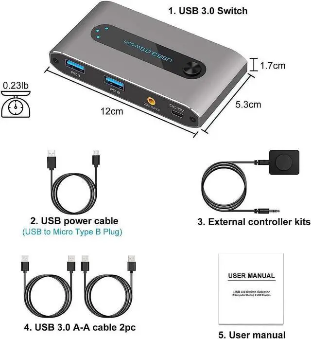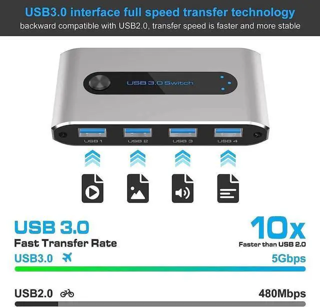 The 4-Port USB 3.0 Switch is a great option for sharing 4 USB 3.0 or USB 2.0 devices between two computers and saves time and space!The USB 3.0 switch allows up to 2 independent computers to share up to 4 USB 3.0 peripherals. This is ideal for sharing a printer or Scanners in an office environment.