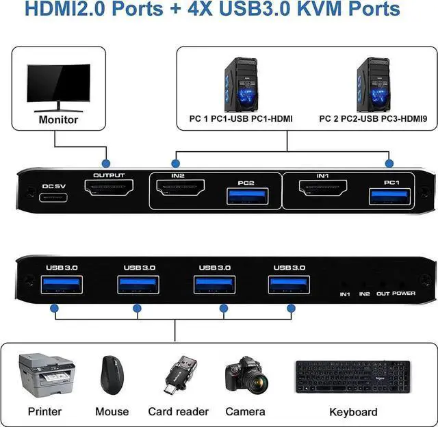 USB KVM Switch HDMI - USB and HDMI KVM switch allow a one-click swap between 2 computers to share 4 USB 3.0 peripherals and 1 HD monitor without constantly changing cables or setting up complex shareware. Make your work and life easier and more efficient!