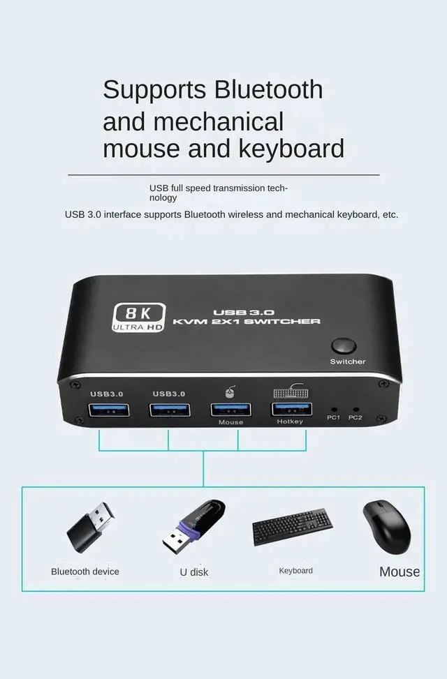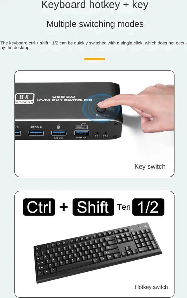 There are two switching modes: button switching and hotkey switching, which eliminates the need for unplugging and plugging, which is convenient and fast. (NOTE: USB 3.0 interface supports Bluetooth wireless and a mechanical keyboard, etc. )