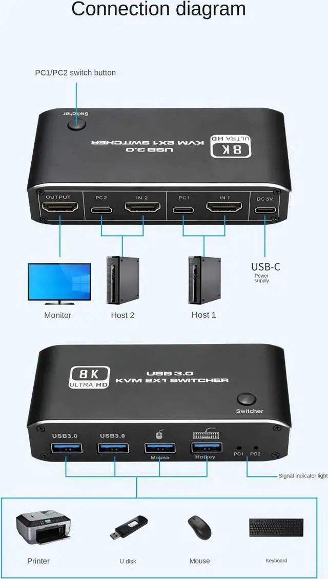 8K HDMI KVM Switch Box allows you to control 2 computers with one set of controls and display (mouse and keyboard).