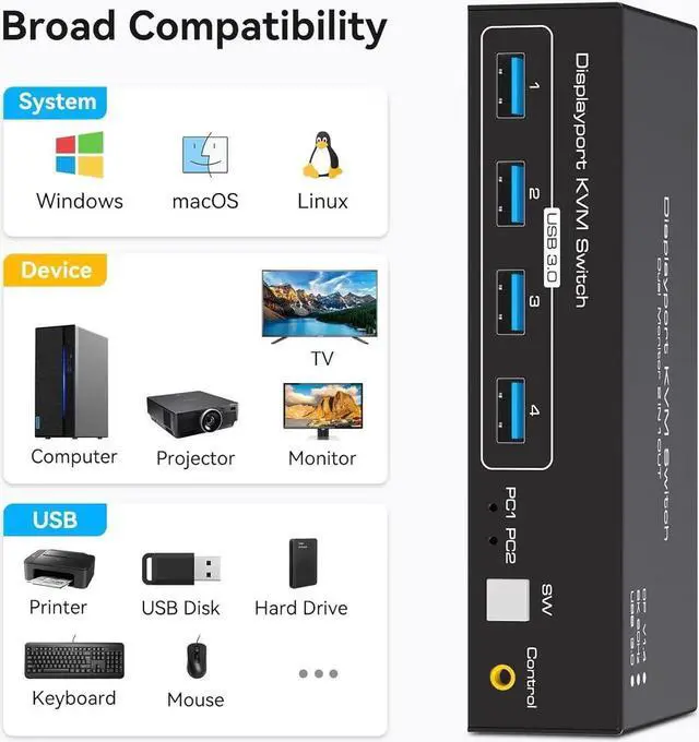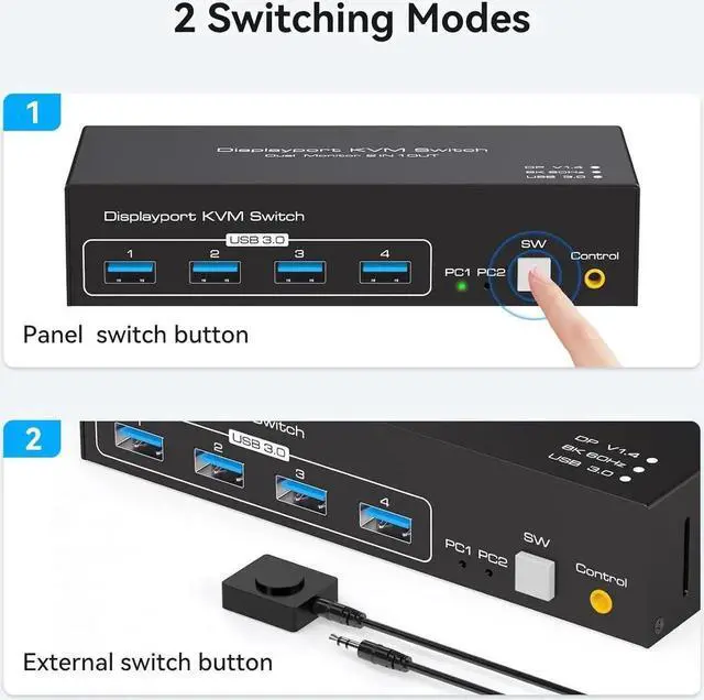 Display Port KVM Switch 2 PC 2 MonitorDisplayport KVM switches allow two computers to share two high-definition monitors and 4 USB 3.0 ports, such as mouse, keyboard, printer U disk, etc. And connect two displays in extend or duplicate display mode.