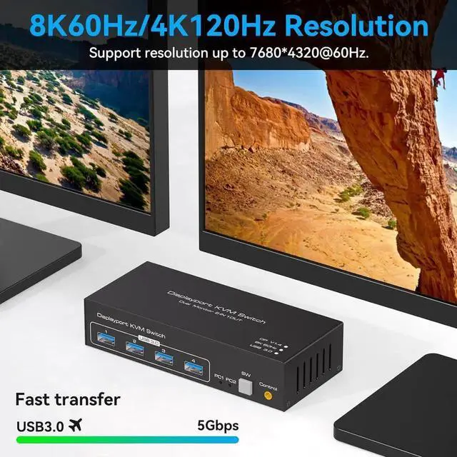 8K KVM SwitchDP 1.4 KVM Switch's resolution up to 4K@120Hz and backward compatible with 4K@60Hz 3D 1080P 720P etc. If your computer and monitor both support 8K, then this KVM switch can achieve the best visual effect without affecting the performance of your PC and monitor.