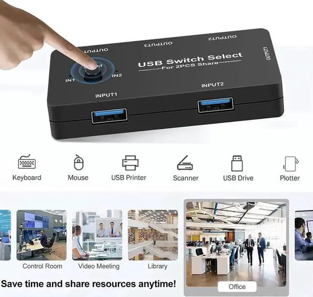 2 in 4 out USB KVM switch box allows one button swapping share 4 USB 2.0 peripherals between two computers without constantly swapping cables or set up complicated network sharing software. Its a great for use at office or home if you need to switch between two PCs, which can improve your work efficiency.