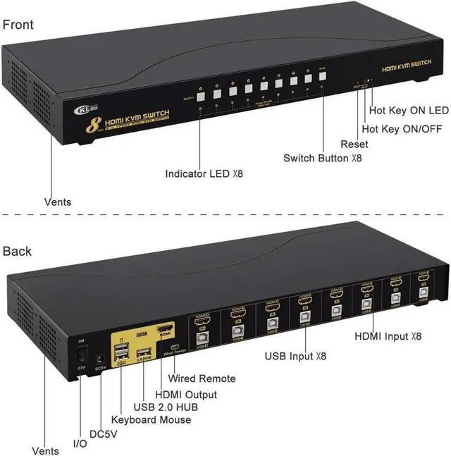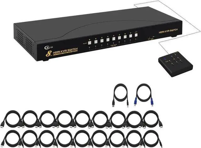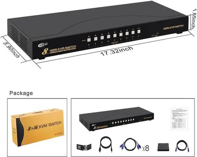 Package: 1 * 16 Port KVM switch + 1 * DC 5V 2A Power adapter + 16 * HDMI Cable + 16 * USB cables + 1 * User manual + 1 wire remote push button