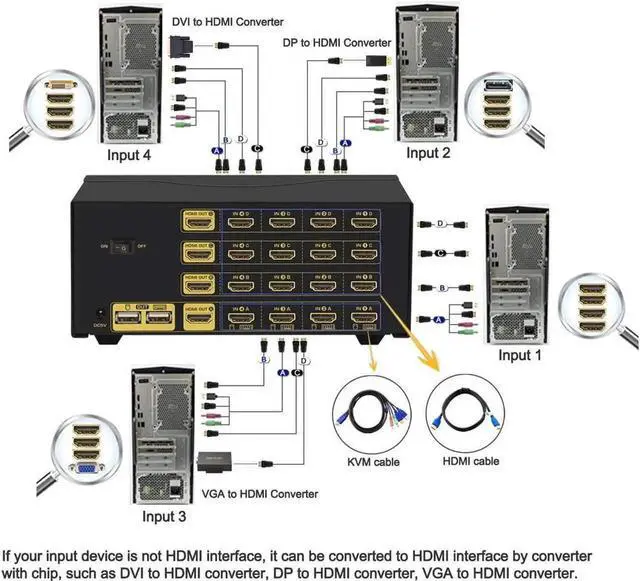 3. Plug USB 3.0 cables, HDMI cables, VGA cables into KVM switch and your computers;
