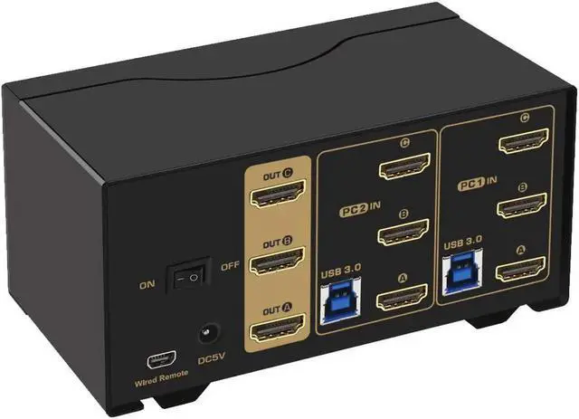 ? 2 PORT TRIPLE MONITOR KVM SWITCH? If you need to manage 2 computers with 3 monitors at home or office, this is for you! It allows you to share one set of keyboard, mouse and 3 monitors for extended or mirrored display between 2 devices, and get jobs done more efficiently;? USB 3.0 KVM SWITCH 3 Monitors? Most KVM Switches out there are USB 2.0 version, with this one you not only get 2 extra USB 3.0 HUB ports for up to 5Gbps/s data transferring rate (10 times faster than USB 2.0 ), but also swapping higher capacity USB devices like webcam, headset, hard disk, printers etc.