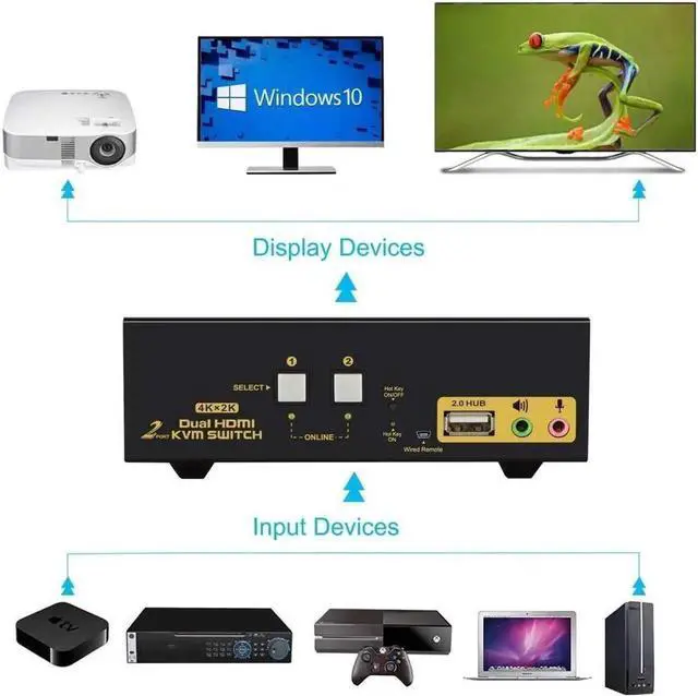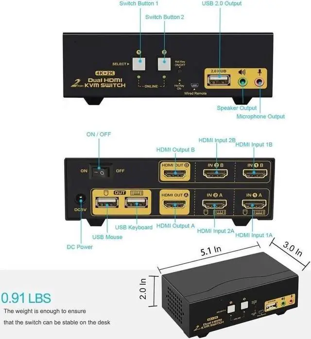 5. Wired remote switch?? DRIVER FREE KVM HDMI SWITCH WITH USB 2.0 HUB???? Plug and play with no driver needed: include all cables and DC 5V power adapter, with extra USB 2.0 port for sharing USB printers, scanners and jump drives, wireless and gaming keyboard mouse.?? 4K HDMI KVM SUPPORT AUDIO MIC. AND AUTO EDID?? Enjoy high resolution with auto EDID and
